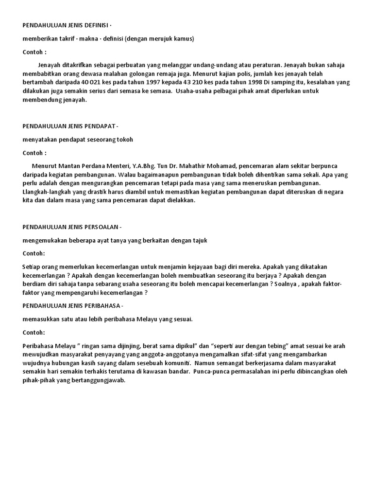Pendahuluan merupakan bab pertama dari karya tulis yang berisi jawaban apa dan mengapa penelitian itu perlu dilakukan. Jenayah bukan sahaja membabitkan orang dewasa malahan golongan remaja juga. 1Pendahuluan jenis definisi 2Pendahuluan jenis pendapat 3Pendahuluan jenis suasana 4Pendahuluan jenis persoalan 5Pendahuluan jenis peribahasa 6Pendahuluan jenis puisi Contoh untuk menerangkan cara membuat pendahuluan 1Pendahuluan Jenis Definisi-soalan.